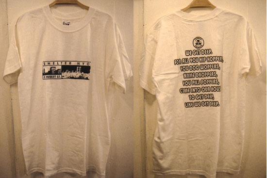 <SOLD OUT> 日本でも絶大なる人気を誇る、TIMMY REGISFORDによるパーティ「THE SHELTER」。 これは以前SHELTERがあった、6 HUBERT ST.をモチーフにしたTシャツです。背中のメッセージもDEEPでカッコいいです! もちろん新品です。今後新しい色も入荷予定! デッドストックの商品ですので、全サイズ揃ってないことをご了承下さい。 写真一番上の<ホワイト>のサイズは、L<76×56×21>、 ※サイズの詳細はこちらを御覧下さい。 ※御注文の方は、HOW TO ORDERをご参照の上、サイズとカラーを明記し、こちらまで御連絡下さい。 |