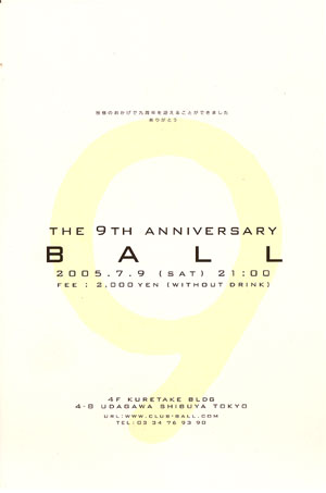 The 9th Anniversary Party 我らがDJ FUKUBAのGO BANGでもおなじみの、渋谷のクラブBALLが9周年を迎えます!それを記念して明日7月9日はパーティがありますよ!要Check! |