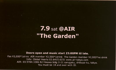 Garden 明日7月9日は、Toshiyuki Goto放出と同時に、Airでパーティーです。The Garden。要チェック。 |